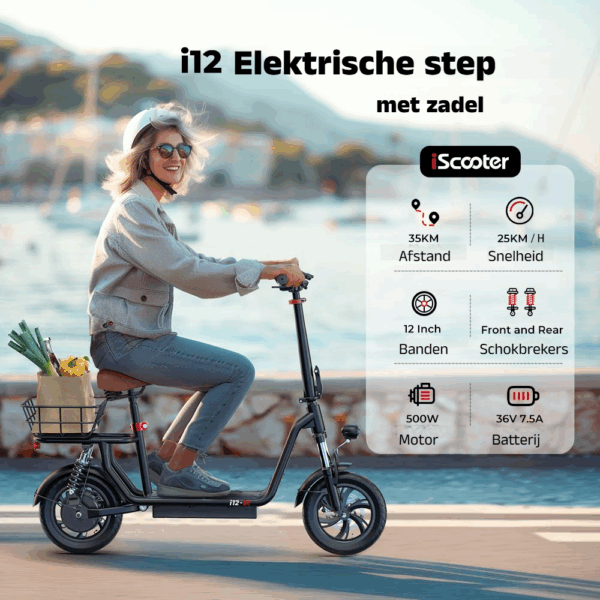 De Iscooter i12: comfortabele elektrische step voor volwassenen met zadel, 500W motor, 25 km/u max snelheid en 35 km bereik, ideaal voor dagelijks gebruik. Compact en opvouwbaar handig mee te nemen op vakantie! Het is mogelijk om dit product gemonteerd te bestellen. Voor gemonteerde modellen geldt altijd afhalen. Selecteer hiervoor de optie: afhalen gemonteerd.
