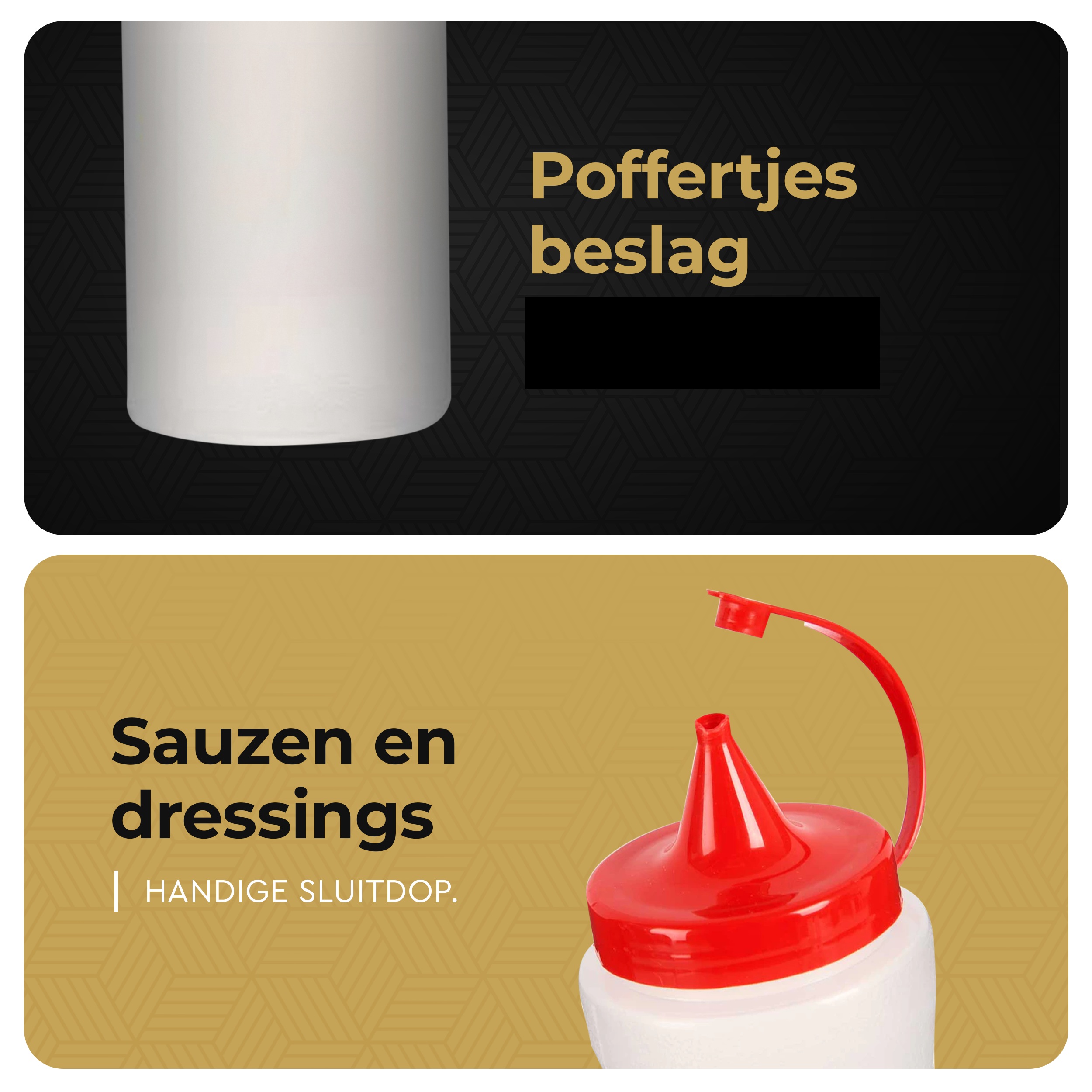 Set van 3 stuks: Met deze set van 3 doseerflessen kun je eenvoudig verschillende ingrediënten doseren voor poffertjes en meer.