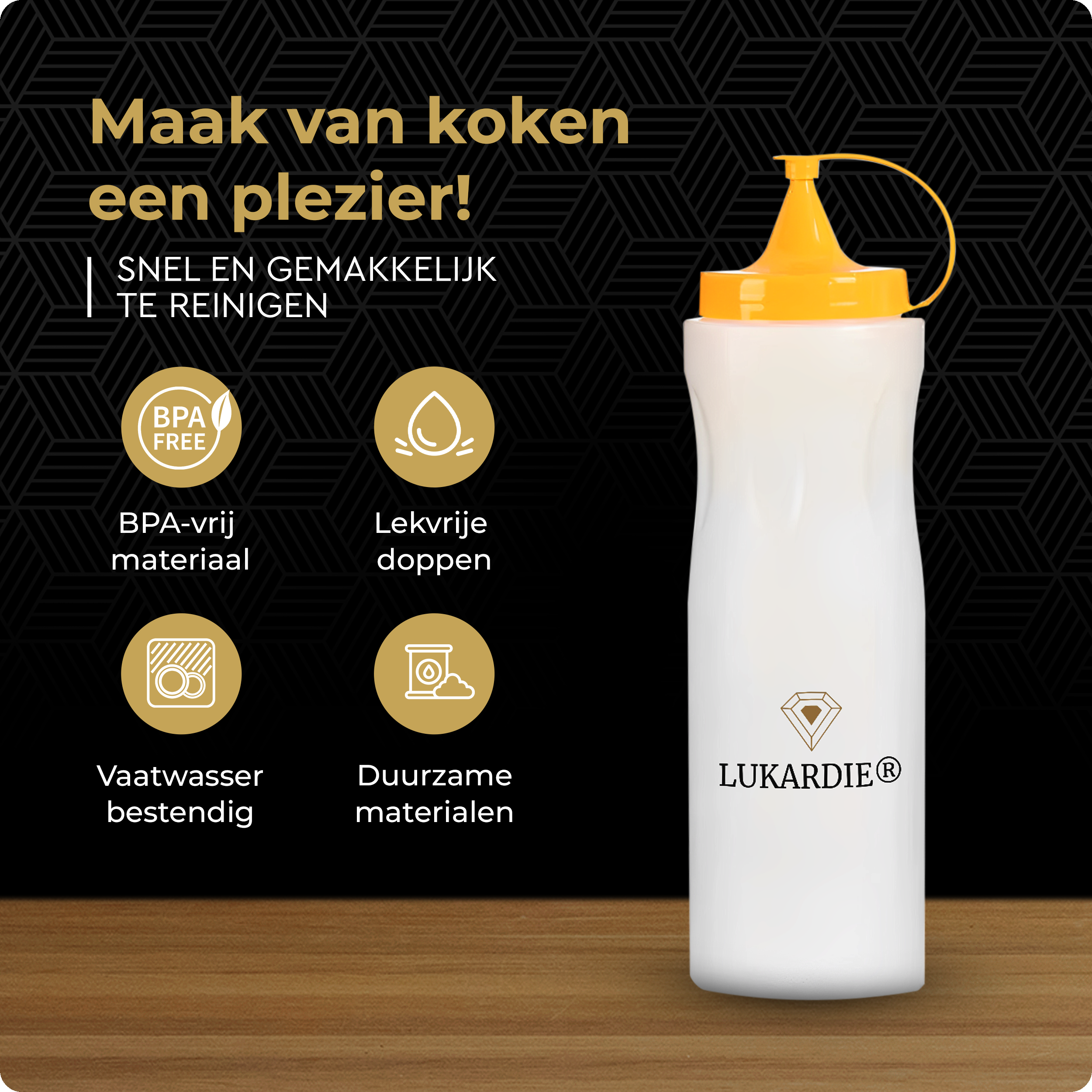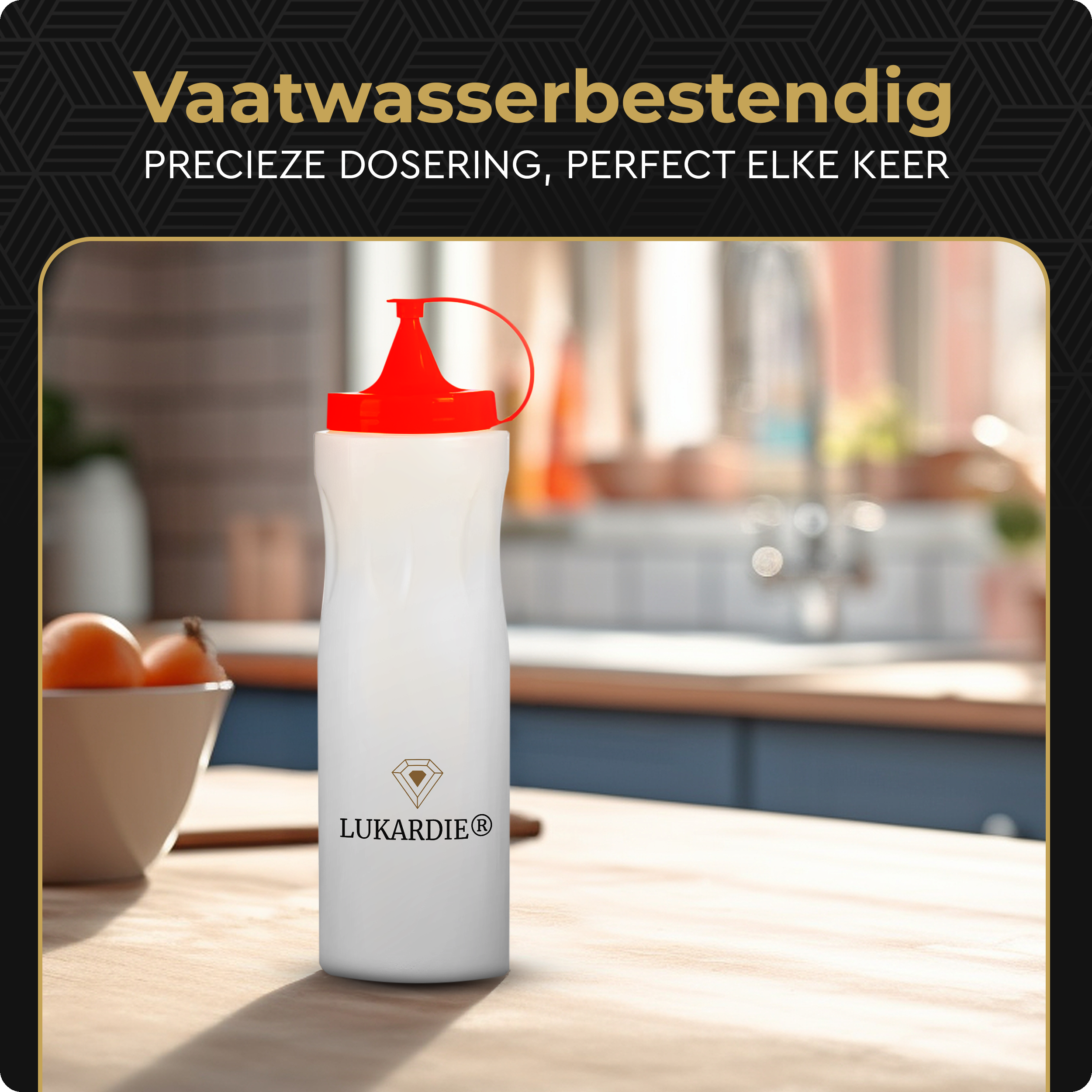 De Lukardie® Doseerfles XL set van 3 is de perfecte keukenhulp voor het nauwkeurig doseren van sauzen, beslag en garnering. Elke fles heeft een inhoud van 400ml en is gemaakt van BPA-vrij, vaatwasserbestendig materiaal. Ideaal voor het maken van poffertjes of het decoreren van gerechten.