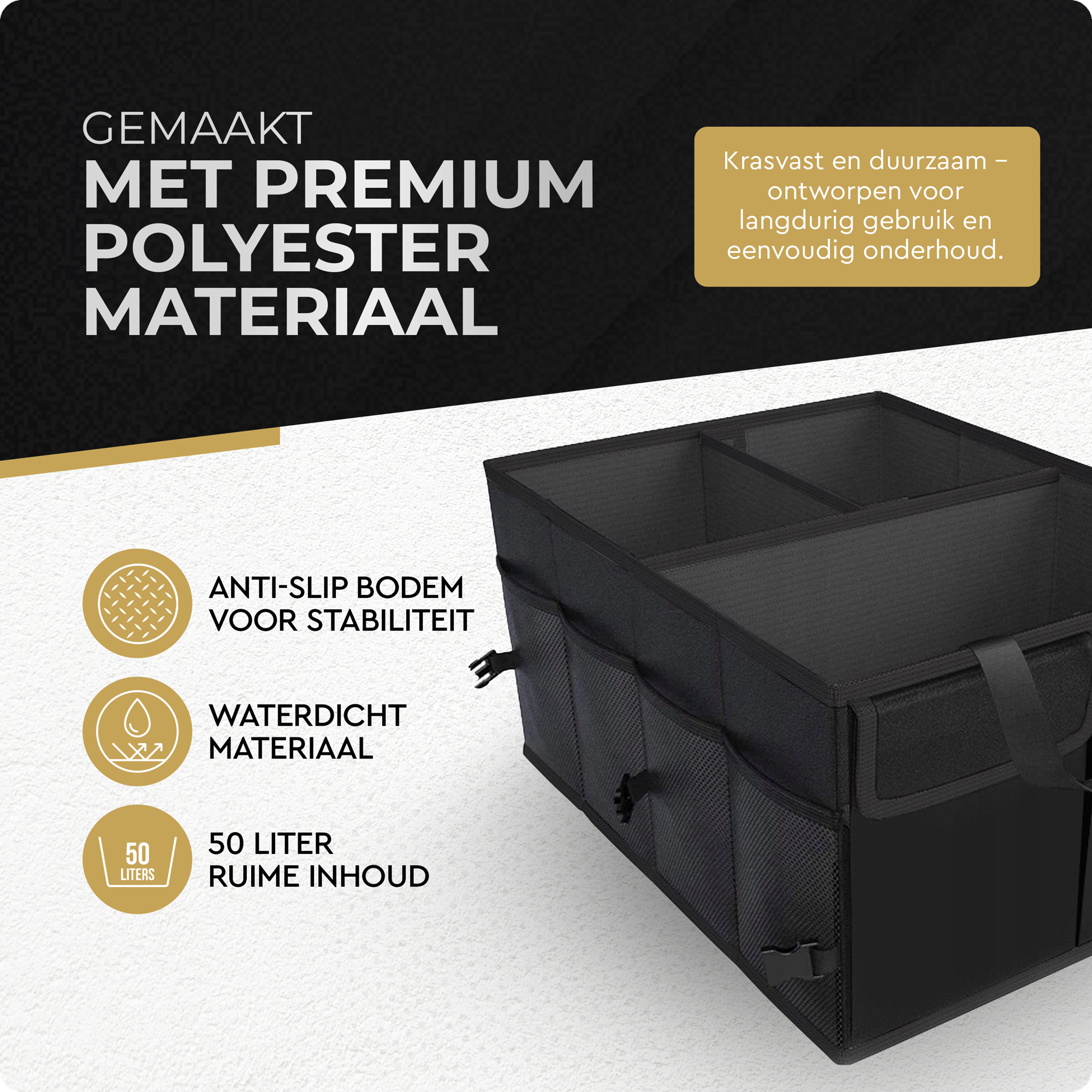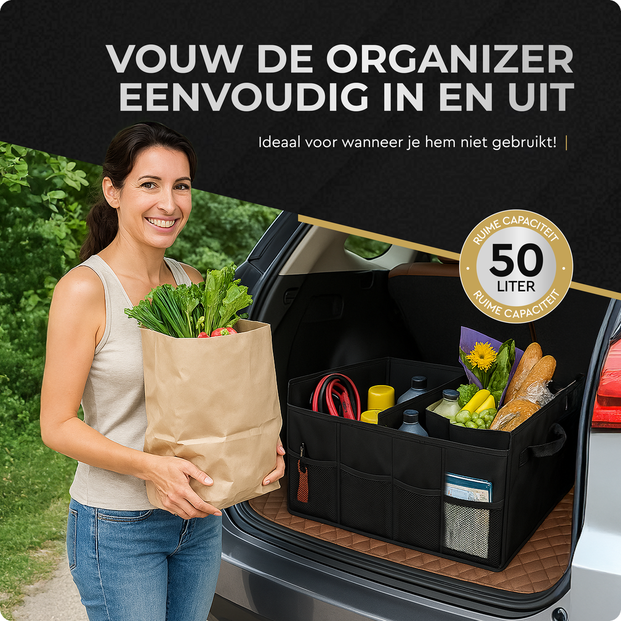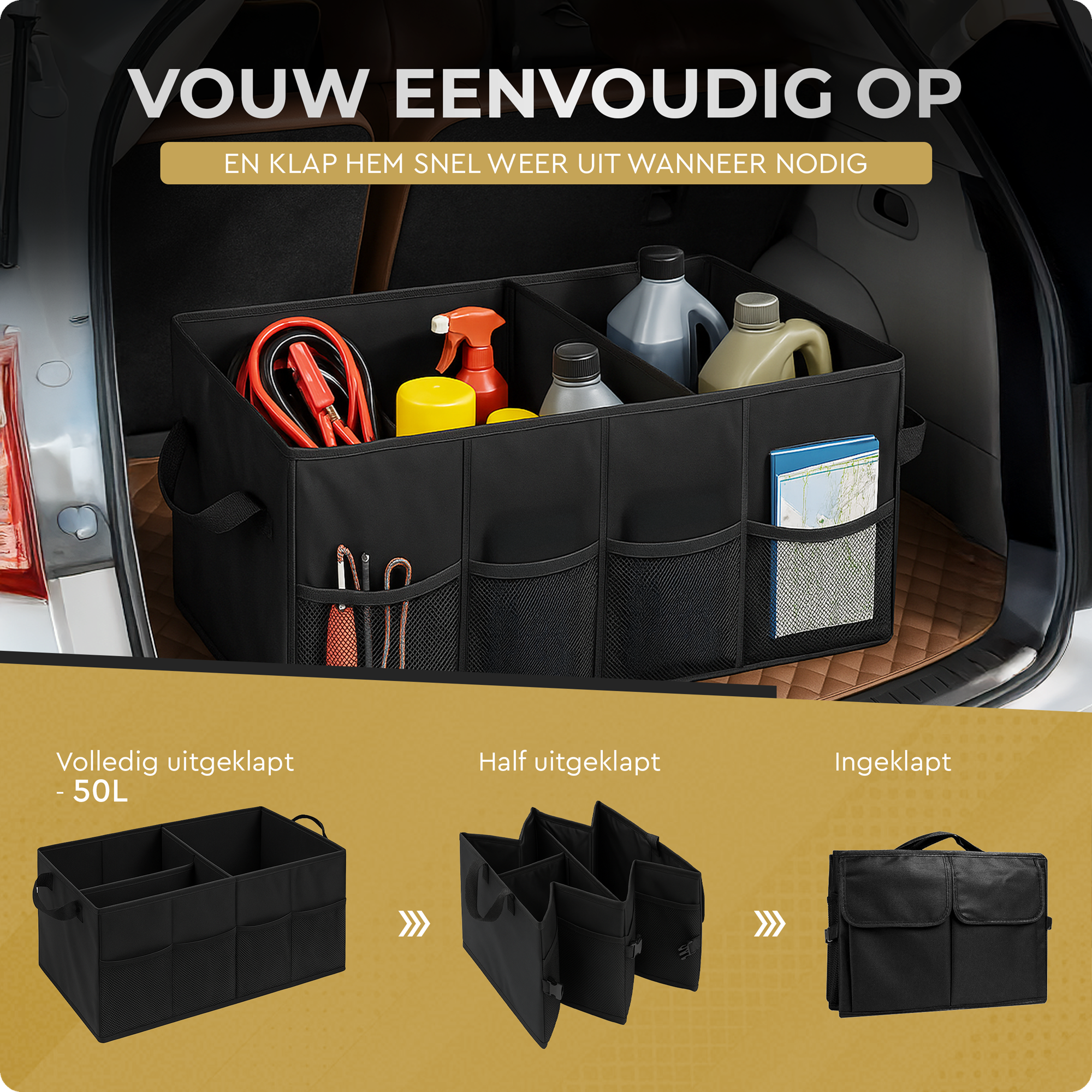 De Kofferbak Organizer heeft een inhoud van maar liefst 50 liter. Hier kun je al je spullen gemakkelijk in opbergen en georganiseerd houden.
