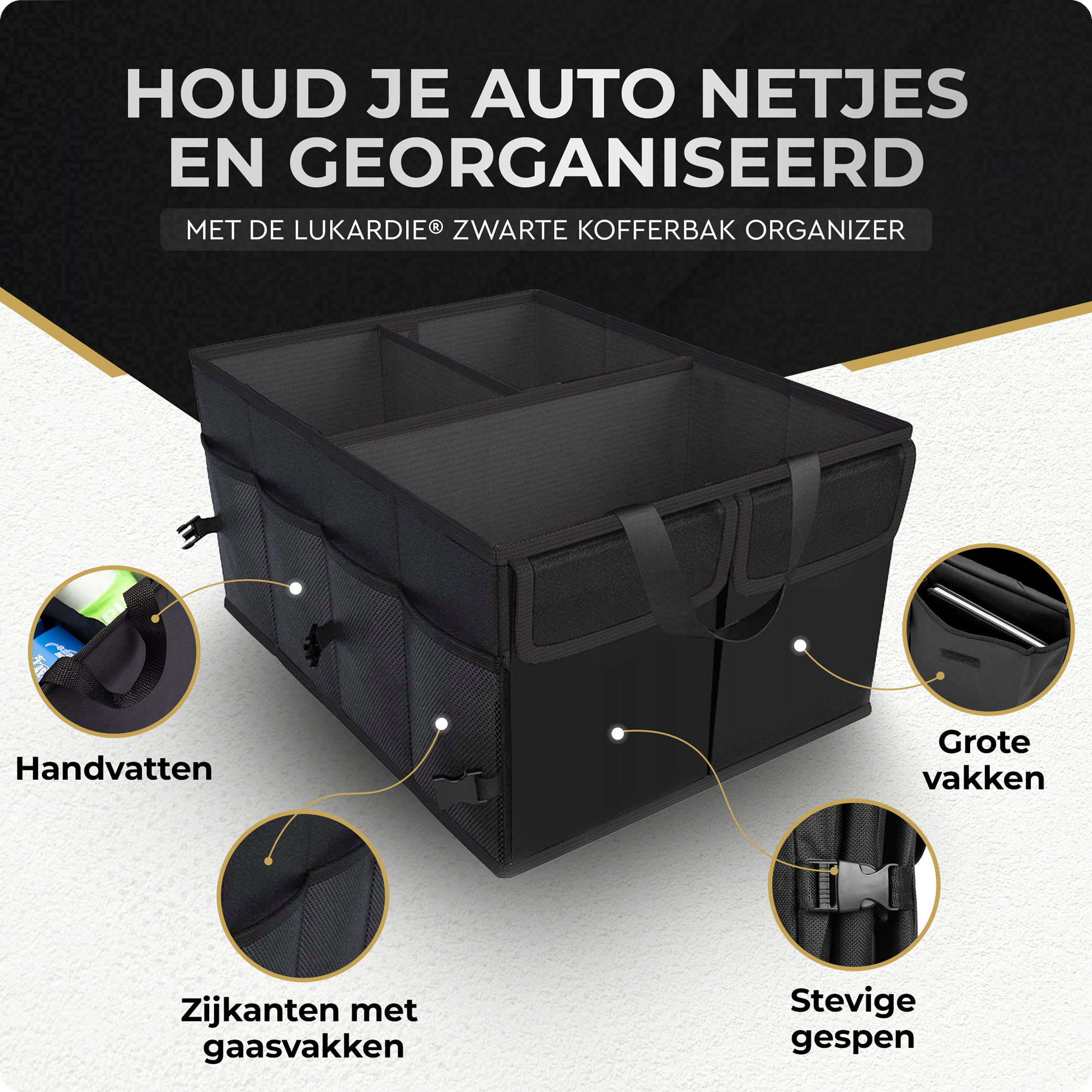 De Lukardie® Kofferbak Organizer is ontworpen met het oog op functionaliteit. De handige tussenschotten stellen u in staat om de binnenruimte naar wens in te delen, waardoor u verschillende soorten spullen gescheiden en geordend kunt opbergen. Daarnaast zijn er diverse extra opbergvakken en vakjes aan de buitenzijde, ideaal voor kleinere items die u snel bij de hand wilt hebben. Zo creëert u een overzichtelijke en efficiënte indeling van uw kofferbak.