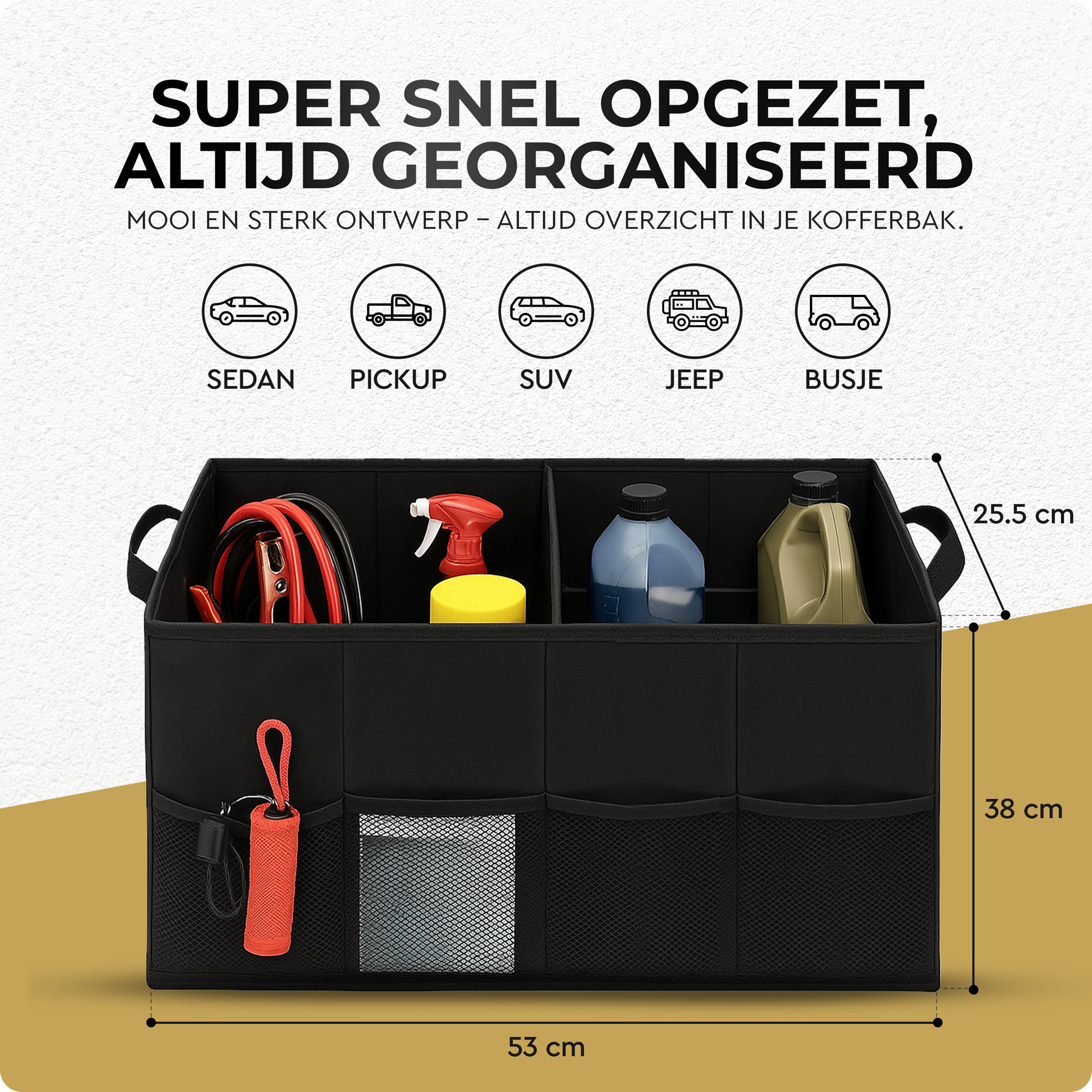 6. Met afmetingen van 53x38x25,5 cm past de organizer perfect in de meeste autokofferbakken.